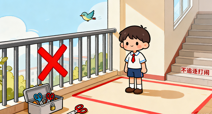 3安全使用居家设施:不攀爬阳台、窗台、空调外机等危险部位,防止发生坠落事故。使用刀具、剪刀等尖锐物品时,要注意安全,避免划伤自己。不玩危险的游戏,如在楼梯间追逐打闹、从高处抛掷物品等。