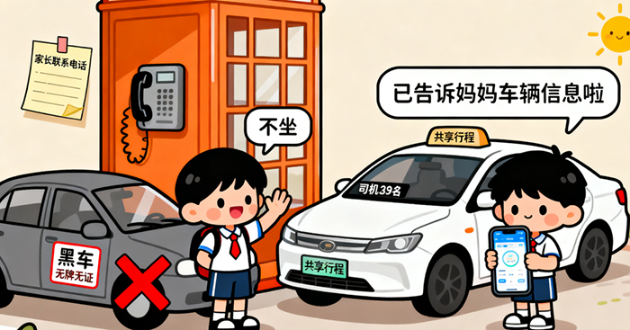 2选择正规出行方式:不乘坐无牌无证、超员超载、车况不良的车辆,如“黑车”“摩的”等。如果需要乘坐网约车,要提前将车辆信息(车牌号、司机姓名、联系方式)告知家长或老师,并在乘车过程中实时共享行程位置。