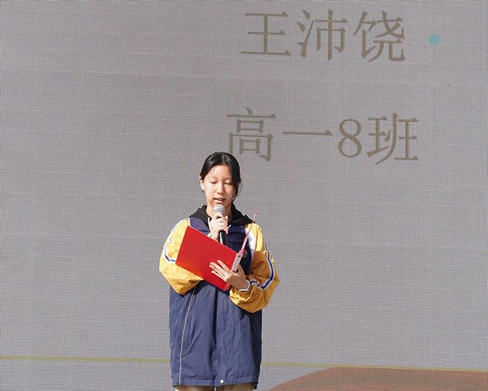 在王沛饶同学的演讲中,她分享了自己步入高中后,与国旗发生的新故事。她坦言,国旗是督促她克服惰性、学会自律的“严格导师”;在她因学业受挫而沮丧时,那风中昂扬舒展的旗帜,更成为了她汲取力量的源泉,让她领悟到“风越大,旗帜越是招展”的道理。王沛饶同学的讲述,将“爱国”这一崇高情怀,具象化为每一个争分夺秒的清晨和每一次面对困难后的成长。她表示,将与同学们一起,用琅琅书声和不懈奋斗,作为对国旗最真诚的礼赞与承诺。