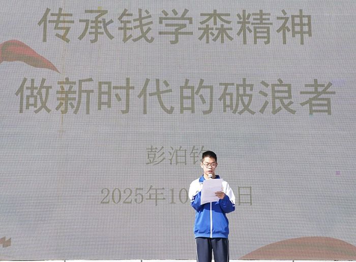 升旗礼毕,来自高一钱学森班的彭泊钧同学首先发表了题为《传承钱学森精神,做新时代的破浪者》的演讲。他深情回顾了70年前钱学森先生冲破重重阻挠、毅然归国的壮举,阐释了“钱学森精神”中“爱国、求真、创新”的深刻内涵。彭泊钧同学表示,作为钱学森中学的一员,“钱学森精神”并非遥远的符号,而是每日的鞭策和前行的灯塔。他号召全体同学,要敢于想象、勇于创新,将个人成长汇入时代洪流,肩负起新时代青年的责任与担当,为民族复兴贡献智慧与力量。