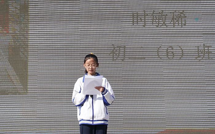仪式上,初二(6)班时敏稀同学发表了题为《我和国旗合个影》的国旗下讲话,她以国庆期间与国旗合影的亲身经历为引,深情讲述了对家国关系的理解。