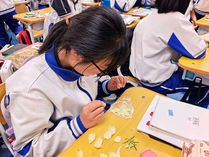 同学们纷纷发挥创意与想象。他们小心翼翼地排列组合,斟酌着色彩的搭配与构图的韵律。有的将花瓣拼成灵动的图案;有的利用叶脉天然的纹理,构筑出充满几何美感的画面;还有的同学在其中嵌入一句悄悄话,让情感与植物一同被珍藏。