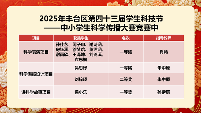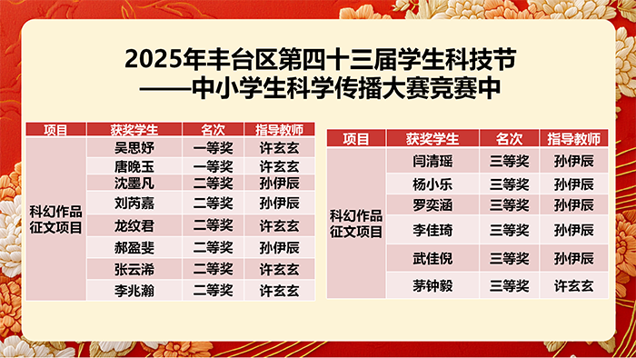 在2025年丰台区第四十三届学生科技节——中小学生科学传播大赛中,钱中学子以丰富的形式展现科学之美,奖项覆盖多个项目: