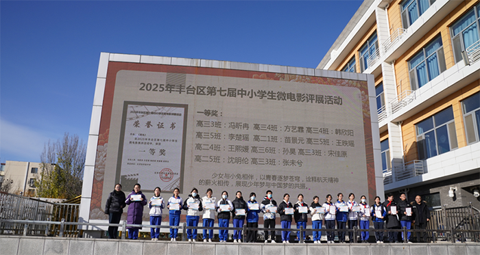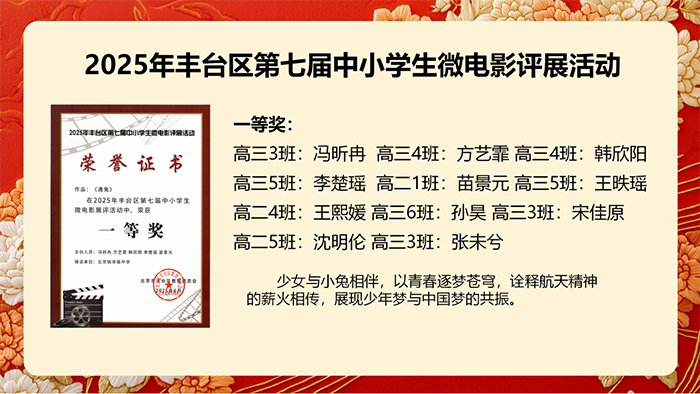 2025年丰台区第七届中小学生微电影评展活动:冯昕冉、方艺霏、韩欣阳、李楚瑶、苗景元等同学创作的航天主题微电影《遇兔》,以“少女与小兔相伴逐梦苍穹”的温情故事,诠释航天精神的薪火相传,生动展现少年梦与中国梦的同频共振,最终荣获一等奖。指导教师许玄玄获“优秀指导教师奖”,学校亦凭借出色的组织工作获评“优秀组织奖”。