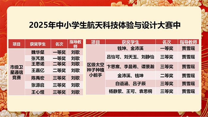 在区级太空种子种植小能手项目中,学子们化身“小小农科家”,在实践中探索生命科学与航天技术的关联:钱坤、金沛溪组合摘得一等奖,金沛溪、钱坤组合再获二等奖;吕怡可、刘天玉、刘静怡组合,卞思宸、李晨希、谭景瀚组合,白语涵、吕子辰组合,杨静萦、王可、袁思桐组合均获三等奖,贾雪瑶老师的悉心指导为学子们的实践探索保驾护航。