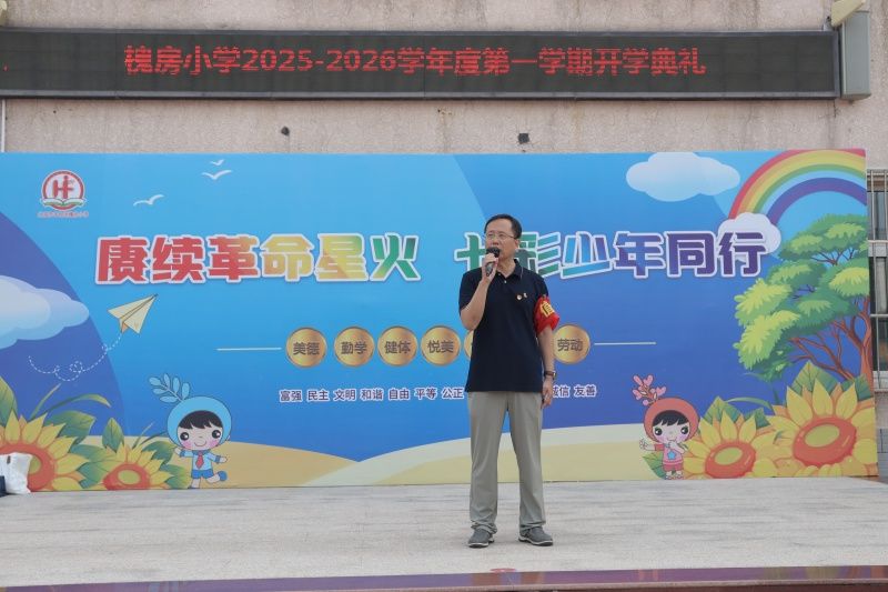 金秋送爽启新篇,丹桂飘香迎学子。9月4日,槐房小学全体师生齐聚操场,举行了“赓续革命星火,七彩少年同行”2025---2026学年度第一学期开学第一课活动,以一场充满希望与力量的开学第一课活动,正式拉开新学期的帷幕。飘扬的国旗、嘹亮的国歌,不仅点燃了师生们的爱国情怀,更凝聚起大家逐梦新学年的坚定信念。