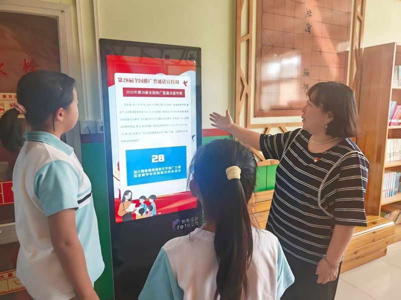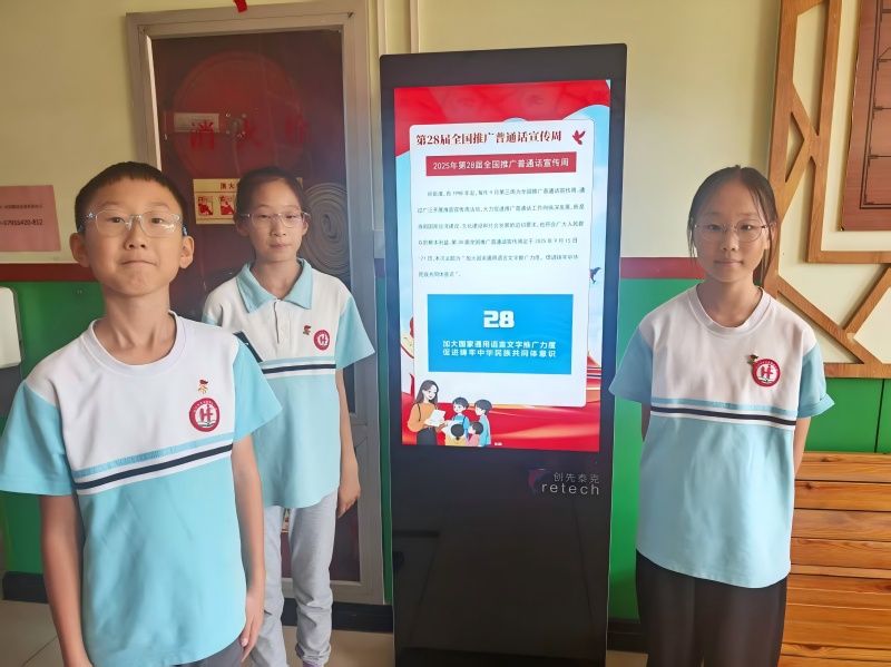 9月15日的升旗仪式中,学校向全体师生发出倡议:普通话是沟通的桥梁,规范字是文化的载体,承载着中华千年的文明脉络,书写着民族的精神密码。我们要从课堂交流、作业书写等日常小事做起,让普通话成为校园里的“通用语”,让规范字成为笔下的“标准字”。 普通话推广周期间,各班班主任也积极行动,借助班队会开展“说好普通话,写好规范字”主题宣传。学校一楼、二楼的多功能触屏也变身“普通话推广宣传站”。一幅幅设计精美的宣传图片循环播放,课间时分,不少同学驻足观看,有的轻声朗读宣传语,有的互相提醒读准字音,书写时要注意规范,浓厚的推广氛围感染着每一位师生。