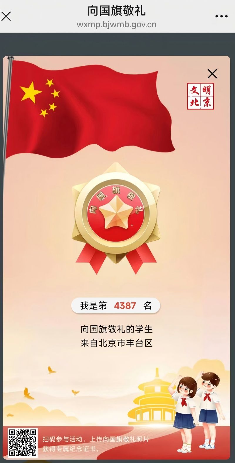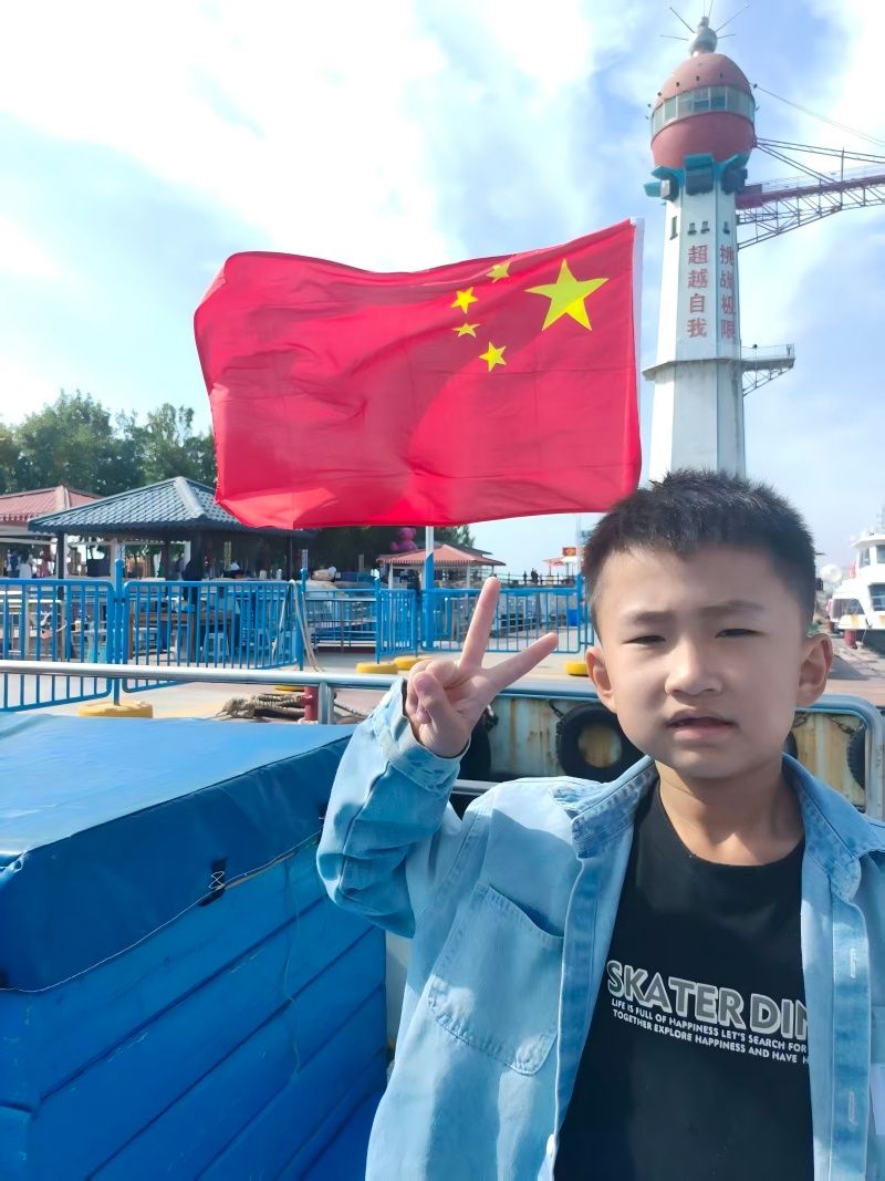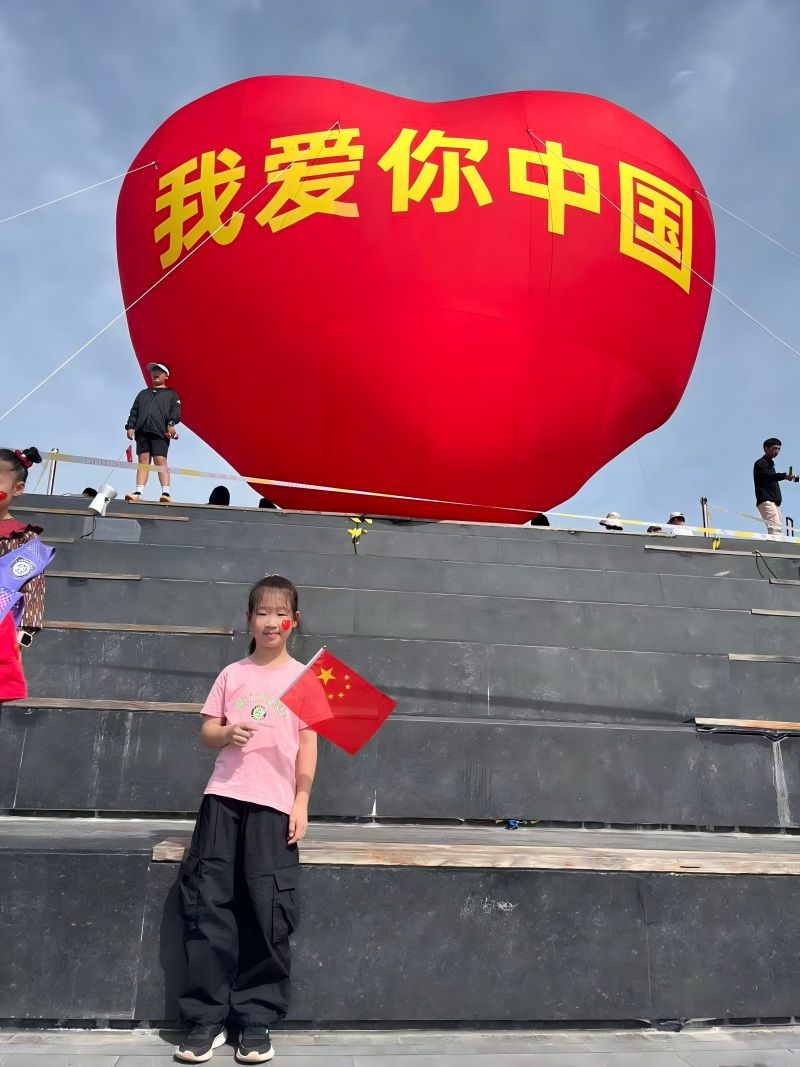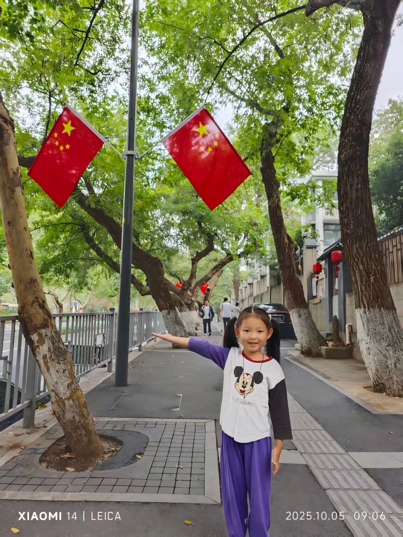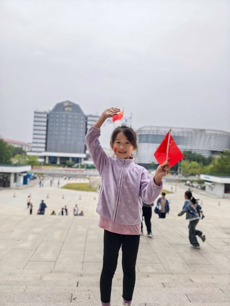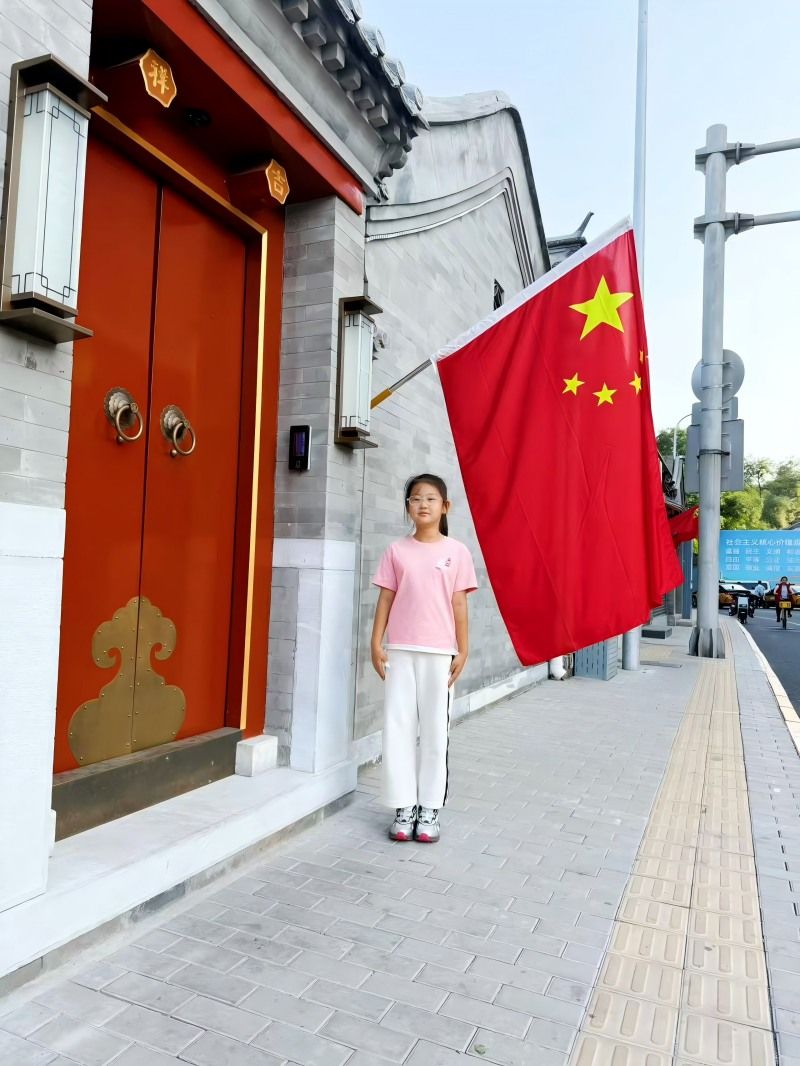 “向国旗敬礼”活动以“线上寄语+线下实践”双线并行,为孩子们搭建起与祖国对话的桥梁。线上,同学们登录首都文明网站,指尖轻敲键盘,将对祖国的祝福凝练成一句句真挚寄语,稚嫩的文字里满是对祖国母亲的崇敬与期许;线下,孩子们在家人的陪伴下,走进爱国主义教育基地:中国航空博物馆、西柏坡纪念馆、北京焦庄户地道战遗址纪念馆以及天安门广场等地方,孩子们凝视历史文物、聆听英雄故事,在触摸岁月痕迹中懂得今日幸福生活的来之不易;有的孩子还观看了红色影片,让经典影像走进童年,影片里的动人情节,让孩子们读懂了“爱国”不是抽象的词汇,而是危难时的挺身而出、平凡中的坚守奉献;“我和国旗留个影”环节更成了假期里最亮眼的风景,孩子们或在天安门广场挺直腰板,或举着小国旗与社区里的大国旗同框,一张张笑脸映着鲜红的国旗,定格成2025这个国庆节最温暖的画面。