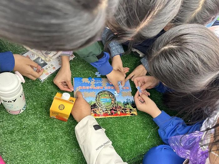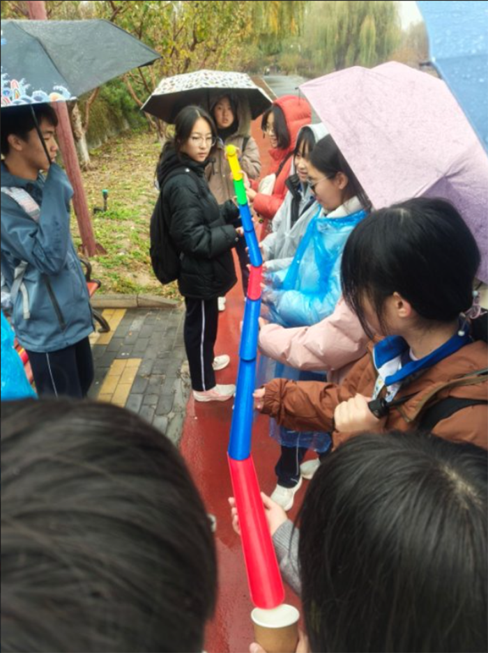 活动中,同学们以小组为单位,手持缺块拼图在公园中定向打卡、协作闯关。细雨中的南海子十大景观若隐若现,朱雀迎宾的庄重、上林花坞的婉约、海户人家的质朴,在雨雾中更显韵味。雁影湖畔,氤氲水汽笼罩湖面,雨滴敲出细密涟漪,金黄芦苇摇曳致意,水鸟嬉戏翻飞;岸边几株白梅意外绽放,洁白花瓣缀着晶莹雨珠,素净淡雅的姿态不畏严寒,清幽冷香沁人心脾。“凌寒独自开”的梅花品格,让同学们联想到钱学森先生面对重重困难仍坚守理想、为国奉献的精神,更明白“生命中最美的绽放,往往出现在最寒冷的季节”。