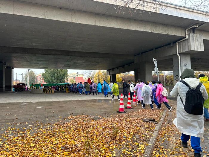 初冬街头,行道树褪去秋华,遒劲枝干映衬着街灯暖光。身着各色雨衣的同学们组成流动的风景线,鲜红班旗在细雨中猎猎作响,成为灰蒙蒙冬日里最亮眼的色彩。“一开始觉得10公里遥不可及,但想到钱学森先生攻克难关的坚持,就有了前行的动力。”一位同学边走边分享。