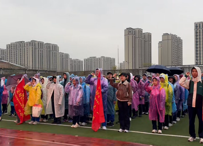 清晨的校园笼罩在轻柔雨雾中,草木含润,空气清新。身着统一校服的同学们在操场整齐列队,眼中满是对徒步挑战的期待与热忱。主席台前,李鹏举校长手持鲜红班旗稳步走来,在雨幕中勾勒出醒目亮色。当象征责任与使命的班旗郑重交付至领队同学手中,现场掌声雷动,既是对征程开启的喝彩,更是对传承精神的宣誓。