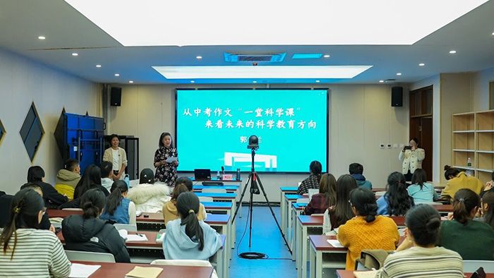 培训中,郭兰兰以“从中考作文看科学教育落地”为主题,结合教学案例,讲解科学素养与学科融合的方法,为青年教师提供可落地的教学策略。这种“理论+实践”模式,正是学校针对青年教师“提升教学实践能力”需求设计,助力解决教学实际问题。