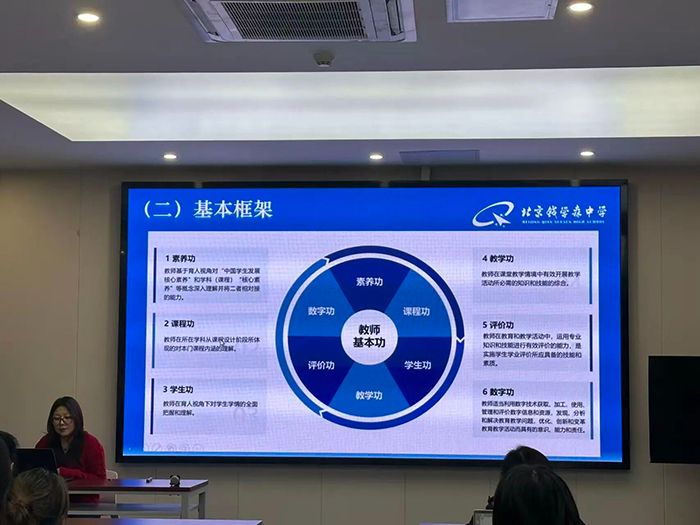 教学副校长王芳以北京市中小学教学基本功培训与展示活动为切入点,围绕“教师基本功的定义、特征与基本框架”展开分享。她强调,教师基本功是育人路上的核心底气,涵盖素养功、课程功、学生功、教学功、评价功、数字功六大维度,既是课堂教学的“硬支撑”,也是教师专业成长的“必修课”。王校长鼓励全体青年教师以“六功”为抓手,在教学实践中锤炼本领,实现从“站稳讲台”到“站好讲台”的进阶。