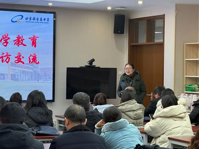 在综合楼二层教师阅览室,代表团观看了学校宣传片,全面了解北京钱学森中学的办学理念、发展历程与科学教育实践成果。随后,信息中心主任张旭刚以《构建科学教育新生态》为题作专题讲座。他指出,科学教育新生态的构建需打破学科壁垒、整合校内外资源、链接真实科研场景,学校以钱学森“大成智慧学”为理论根基,搭建了“课程-活动-实践-评价”四位一体的科学教育体系。在课程层面,融合物理、化学、生物等基础学科与人工智能、航天工程等前沿领域,开发跨学科融合课程;在资源层面,联动航天科研院所、高校实验室等社会资源,打造校外科创实践基地;在评价层面,建立多元评价体系,将学生科创实践、项目研究成果纳入综合评价,真正实现从“知识传授”向“素养培育”的转变。同时,张旭刚主任还分享了学校通过科创社团、科技节、创客工坊等载体,营造全员参与的科学教育氛围,让科学精神融入校园日常的具体举措。