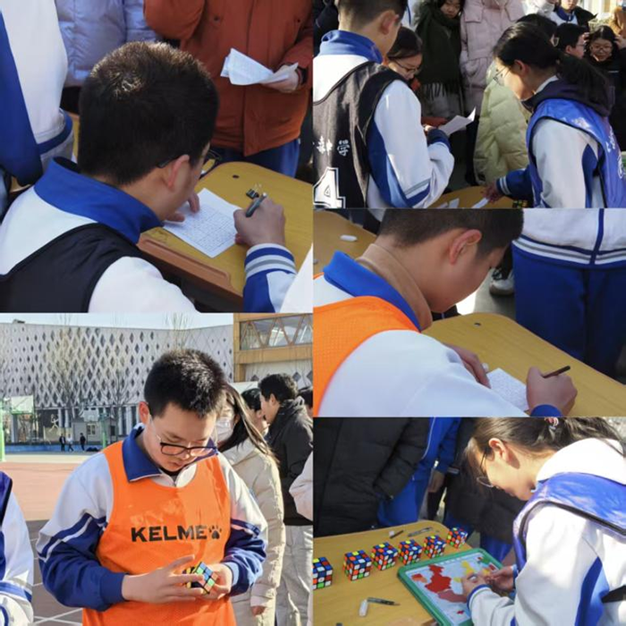 赛场内外气氛紧张而热烈。围观的同学呐喊助威,任务台前不时传来阵阵掌声,那是为迅速解开魔方的巧手喝彩,也是为流畅背诵“节气歌”的声音点赞。在“盲人画画”环节,蒙眼作画的同学寥寥几笔便勾勒出颇具趣味的图案,引得大家赞叹不已;“五个词造句”则展现了学生们活跃的逻辑思维与语言组织能力。
