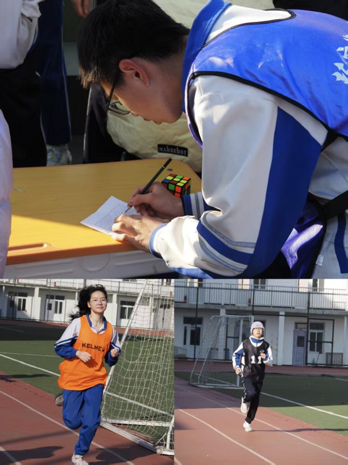 随着体育老师的哨声吹起,比赛正式开始。同学们如离弦之箭冲向任务台,迅速进入“战斗状态”。魔方在指尖飞速转动,数独格子被快速填满,诗词佳句脱口而出,英语词缀巧妙添加,完成任务后,选手们又全力奔向跑道,300米归来,与下一位队友击掌交接。