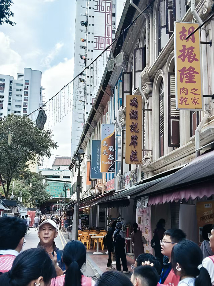 午后,学生们来到了充满历史韵味的牛车水——新加坡的唐人街。这里的街道两旁,传统中式建筑与现代商铺并存,各式庙宇、会馆诉说着早期华人的奋斗史与文化传承。学生们穿梭于市井之间,品尝地道小吃,探访古迹,在与当地商贩和路人的交流中,了解不同族裔的文化习俗与生活智慧。牛车水作为新加坡多元文化的一个缩影,让学生们深刻体会到“和而不同”的文化魅力,增强了他们对中华文化的认同感和自豪感,同时也学会了以更开放包容的心态去理解和尊重世界文化的多样性。途中,学生们还偶遇了当地女子中学的学生前来做社会实践访谈,部分钱校学子接受了采访,并大方地进行英语沟通,展现了钱校学子出色的国际交流能力。