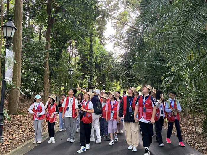 清晨的阳光洒满新加坡植物园,这座世界文化遗产地成为学生们今日研学的第一站。漫步于葱郁的热带雨林,欣赏着胡姬花的千姿百态,学生们不仅沉浸在自然之美中,更通过植物园内详实的英文介绍牌、专业导览员的讲解,完成了对植物种类、生态模式的学习。他们在观察中提问,在交流中思考,将书本知识与现实体验相结合,切身感受到了生物多样性的重要,人与自然和谐共生的智慧。这不仅是一次自然知识的补给,更是一次英语的实景演练,潜移默化中提升了语言应用能力。