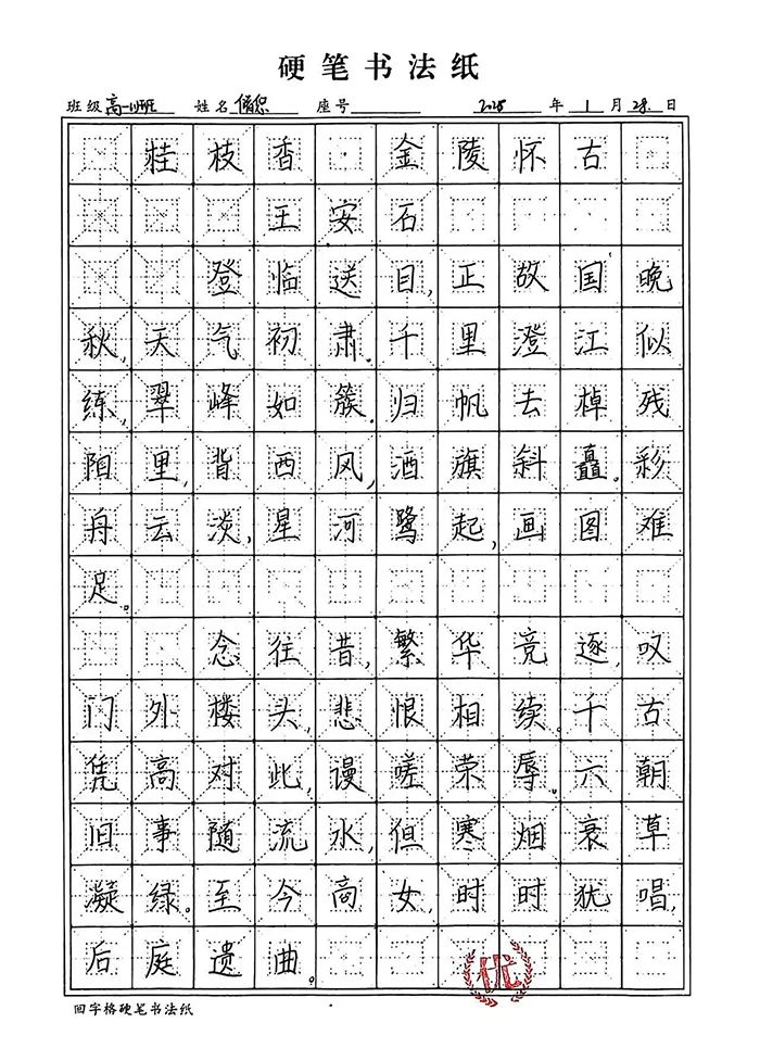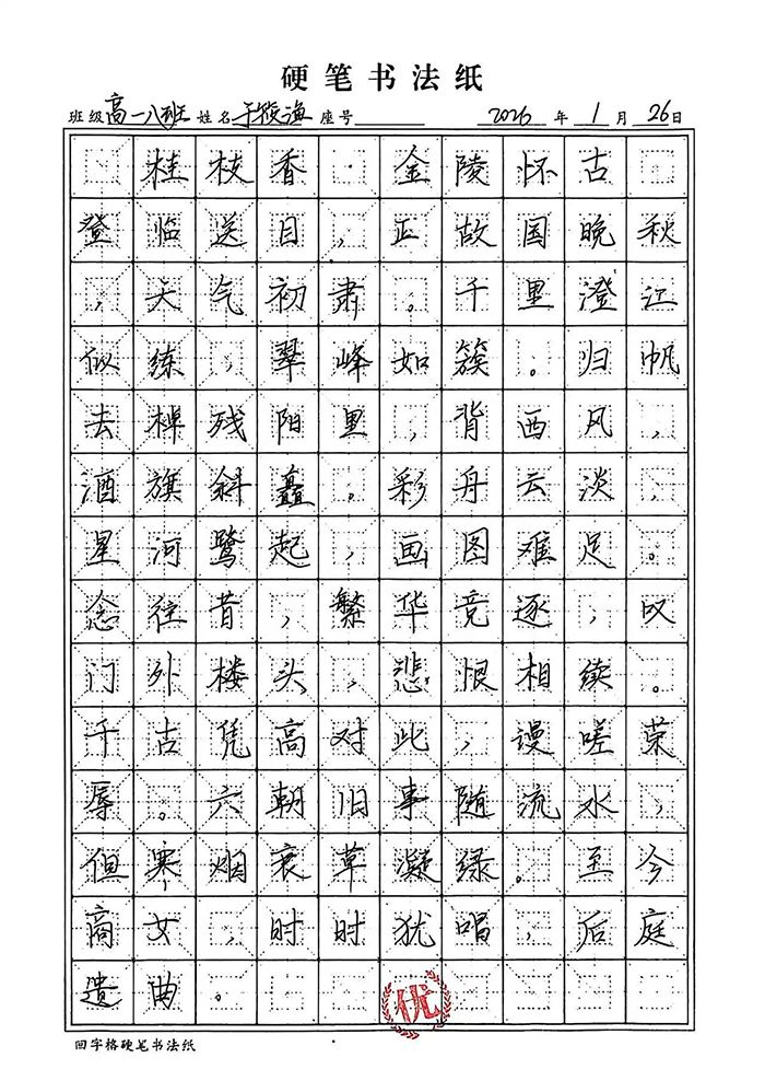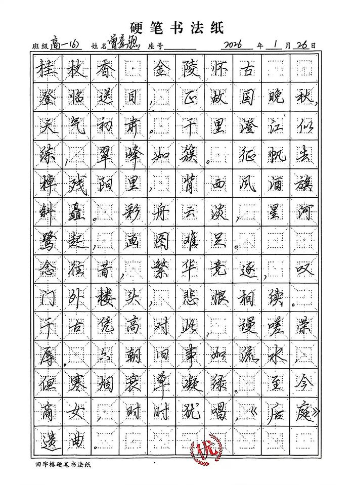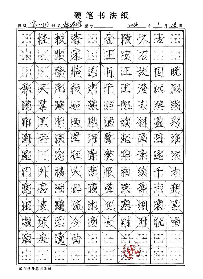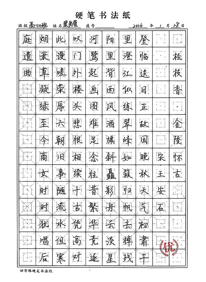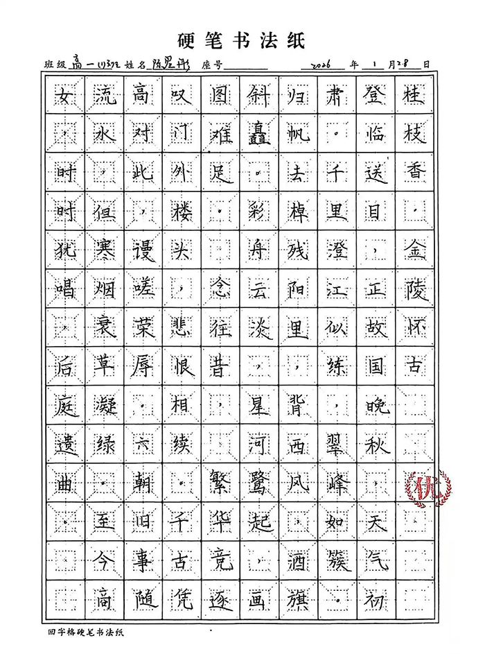 工整赢先机,笔力助提分。在高中学业的赛道上,书写水平早已成为影响应试得分的关键因素。阅卷场上,工整清晰的字迹能快速抓住阅卷老师目光,反之潦草字迹则可能直接拉低得分。规范的硬笔书写,能让答案要点清晰呈现,避免因字迹模糊导致的关键词遗漏,为语文、英语等学科赢得隐形加分;而练字中培养的专注力与严谨性,更能迁移到日常学习中,助力我们在答题时细致规范、减少失误,让每一份努力都能通过工整的字迹转化为优异成绩。
