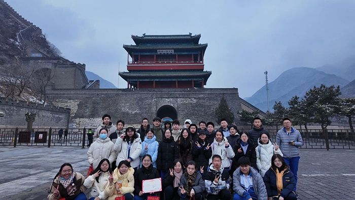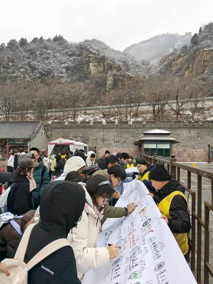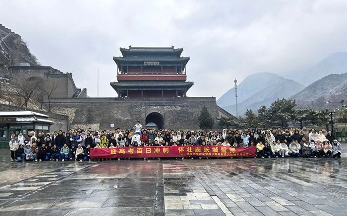 居庸关长城巍峨矗立,“天下第一雄关”匾额在白雪映衬下更显雄浑。全体师生整齐列队,目光坚定,以青春之名,赴百日之约。