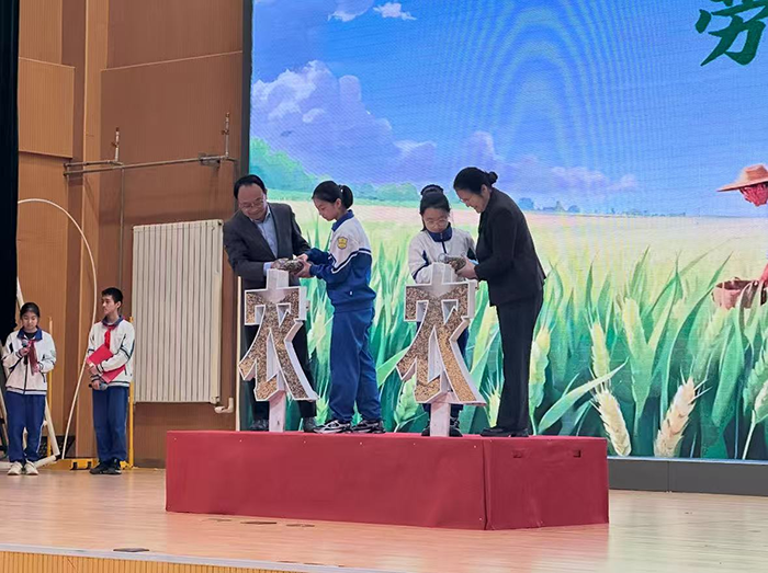 仪式上,校领导和学生代表共同用五谷种子填充“农”字,每一粒种子都承载着对劳动的尊重,对丰收的祈愿。随后校领导向为农耕课程精心筹备的实践基地工作人员致以衷心感谢,向满怀期待参与农耕实践的同学们送上热烈鼓励。希望同学们珍惜此次实践机会,以饱满的热情投入农耕劳动,认真跟随农技师学习农耕知识,用心呵护每一株幼苗,尊重每一份劳动成果,在亲身体验中感悟劳动的价值。