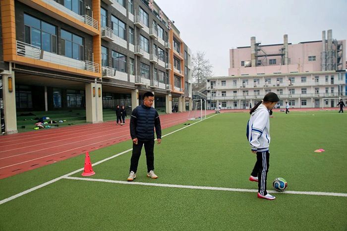 每天下午,钱中的足球场便成了女足姑娘们的天地。夕阳的余晖洒在绿茵场上,映照出她们奔跑的身影,汗水顺着脸颊滑落,浸湿了球衣,却浇不灭心中的热爱。黄老师总是早早来到球场,整理训练器材,等待队员们集合。训练从最基础的热身开始,高抬腿、侧滑步、拉伸韧带,他一遍遍示范,提醒大家注意动作规范,避免受伤。对于颠球、传球、停球、射门这些基本功,黄老师要求格外严格,他知道,扎实的基础是提升球技的关键。