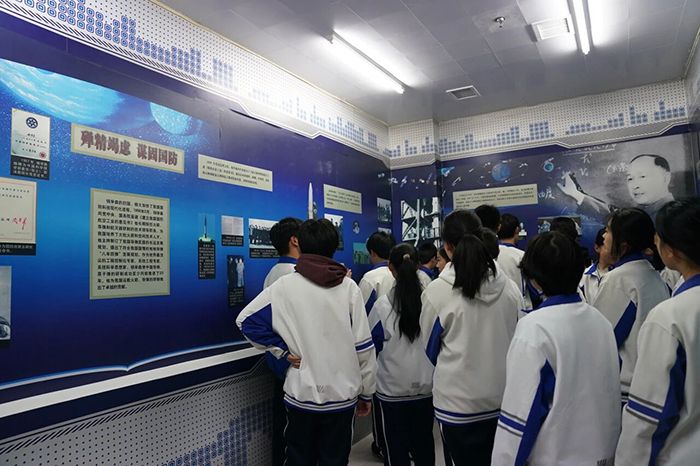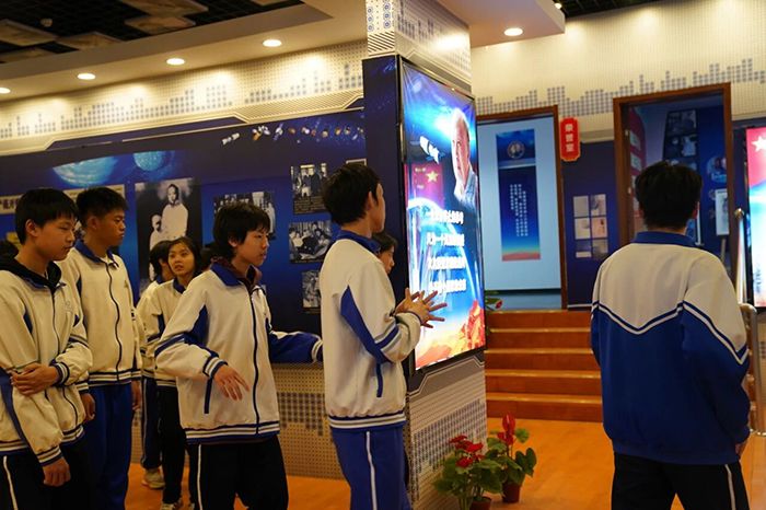 在墙上的图片里钱学森先生在办公桌前写字。简朴的桌椅、常用的书籍与文具,还原了他潜心科研、淡泊名利的日常。同学们静静伫立,仿佛能感受到先生专注钻研的身影,深刻体会到他一生不计名利、一心为国的崇高风范。展区内的钱学森语录墙前,大家轻声诵读“我的事业在中国,我的归宿在中国”“不要失去信心,只要坚持不懈,就终会有成果的”等箴言,字字铿锵,句句有力,深深镌刻在每一位学子心中,成为激励大家前行的精神力量。