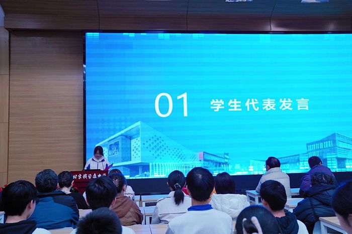 仪式伊始,全场肃立,两位主持人上台演讲,拉开了欢送仪式的序幕。在热烈的掌声中,北校区航天学生代表迈着坚定的步伐走上主席台发言。这位同学深情回顾了此次在本部研学的点点滴滴:从课堂上与本部同学思维碰撞、共探学科奥秘,到科创活动中携手实践、感受航天科技的魅力;从校园文化体验里领略钱中深厚的育人底蕴,到日常相处中收获真挚的同窗情谊。他坦言,这段研学经历不仅拓宽了知识视野,更让大家深刻领悟了“爱国、奉献、求实、创新”的钱学森精神,也真切感受到了本部师生的热情与友善。几位同学代表所有北校区研学同学,向学校搭建的优质研学平台、向本部师生的悉心陪伴与无私帮助致以最诚挚的感谢,并承诺会将研学所学、所感、所悟带回北校区,以更饱满的热情投入学习,发言真挚恳切,字字句句饱含感恩与奋进之心,赢得了全场经久不息的掌声。