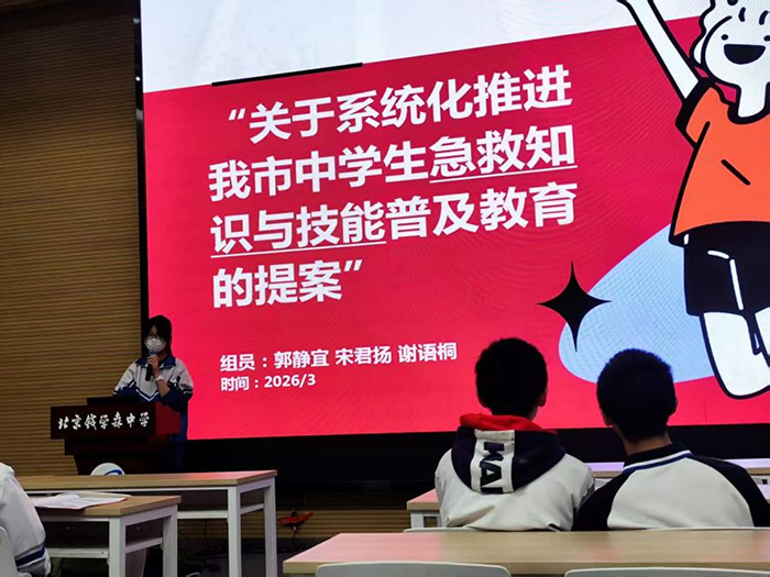 汇报现场,初二(1)班谢语桐代表小组率先登台,带来《系统化推进我市中学生急救知识与技能普及教育》提案。同学们经调研发现,中学生急救知识普及率不足、实践机会匮乏等问题尤为突出,据此提出将急救课程纳入必修课、定期开展模拟演练、推进校园专业急救设备配备等核心建议。