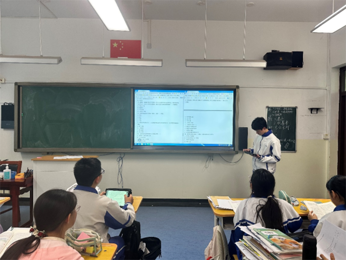 活动以班级为单位展开。每个学生手中都有一本宪法小红本,面对大屏上一道道宪法选择题,大家需要快速翻阅条文,核对正确答案。虽然最终由一人负责答题提交,但全班的同学都在同步查阅、共同思考,为答题的同学出谋划策。每个人都成为了宪法学习的参与者。
