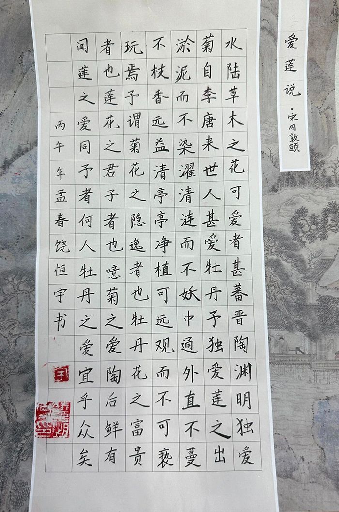 展出作品书体多样、风格鲜明。硬笔书法工整隽秀、笔锋利落,字字尽显严谨规范;软笔书法笔墨酣畅、气韵灵动,幅幅承载传统文化底蕴。作品内容精选经典诗文、励志格言,融入航天精神与校园文化,同学们在横竖撇捺间凝神运笔,在笔墨挥洒中传承中华优秀传统文化。