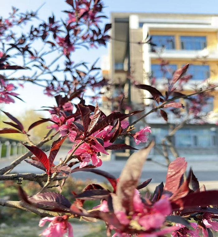 花期:3月中旬至4月上旬(盛花期3月下旬)花朵简介:蔷薇科桃属植物,花瓣粉白或淡粉,花型饱满,紫叶桃叶片紫红,与粉色花朵形成鲜明对比。花朵簇拥枝头,远看如云似霞,微风拂过花瓣轻飘,下起浪漫“花雨”,课间驻足满是青春诗意。