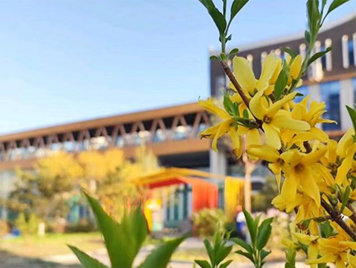 花朵简介:作为北京春花“第一方阵”的代表,木犀科素馨属灌木,枝条细长柔垂,嫩黄小花密集缀满枝头,形似小喇叭,是最早宣告春天到来的花卉。耐寒性强,在料峭春风中率先绽放,满枝金黄,与校园红砖建筑相映成趣,课间漫步一眼便能捕捉初春灵动。