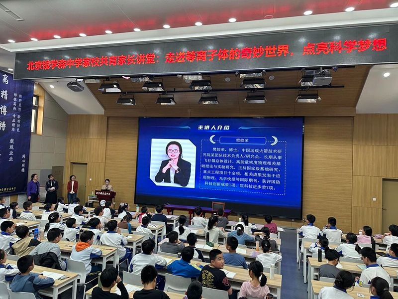 为深化家校共育,点燃青少年科学探索热情,4月23日下午,北京钱学森中学家校共育家长讲堂在阶梯教室温情开讲。本次讲堂以“走进等离子体的奇妙世界,点亮科学梦想”为主题,特邀五年级2班李帛铮妈妈——樊姣荣博士,为启航班带来一场兼具趣味与深度的等离子体科普盛宴。学校王岭书记、杨丽钧副校长出席本次活动。