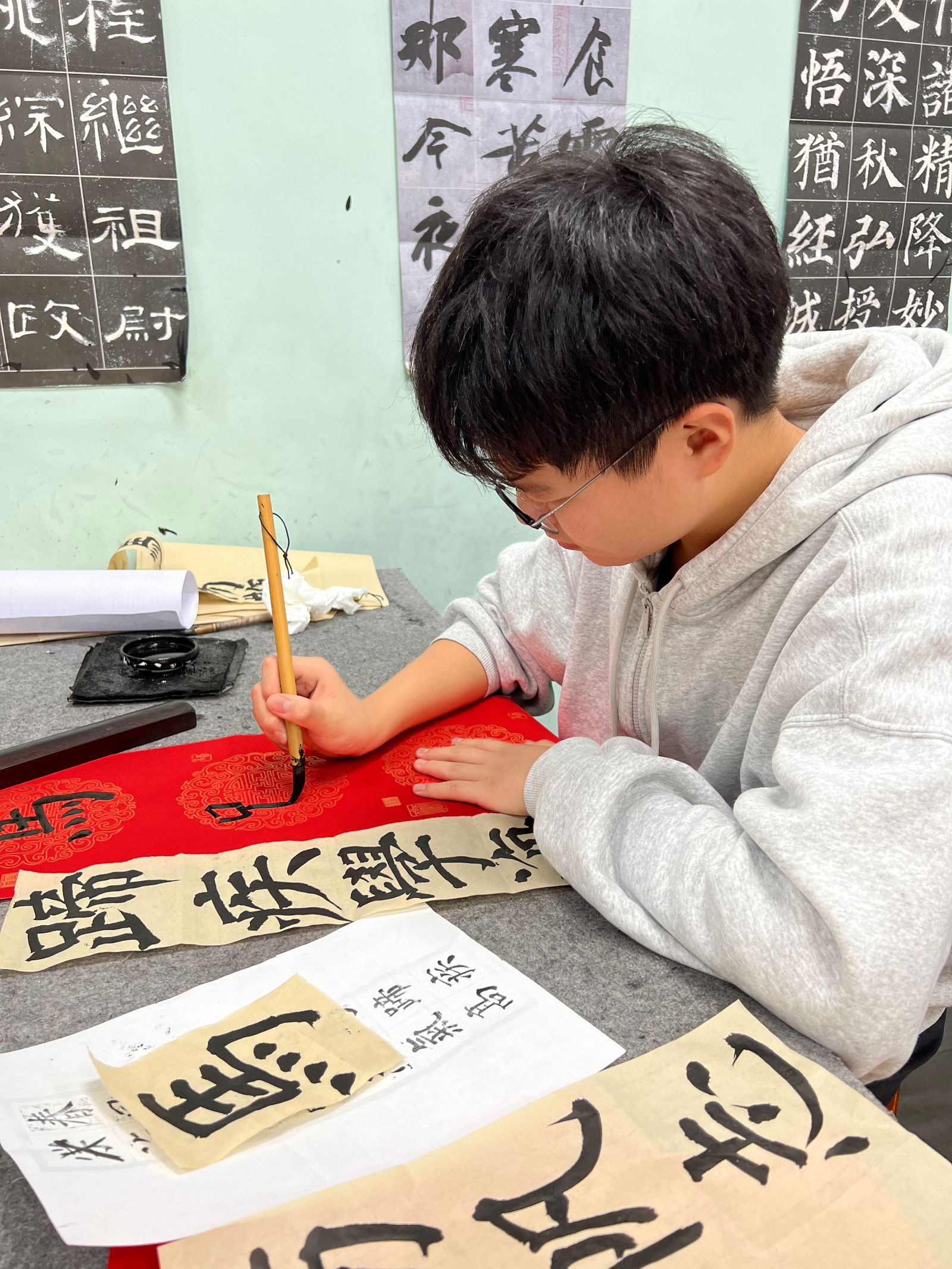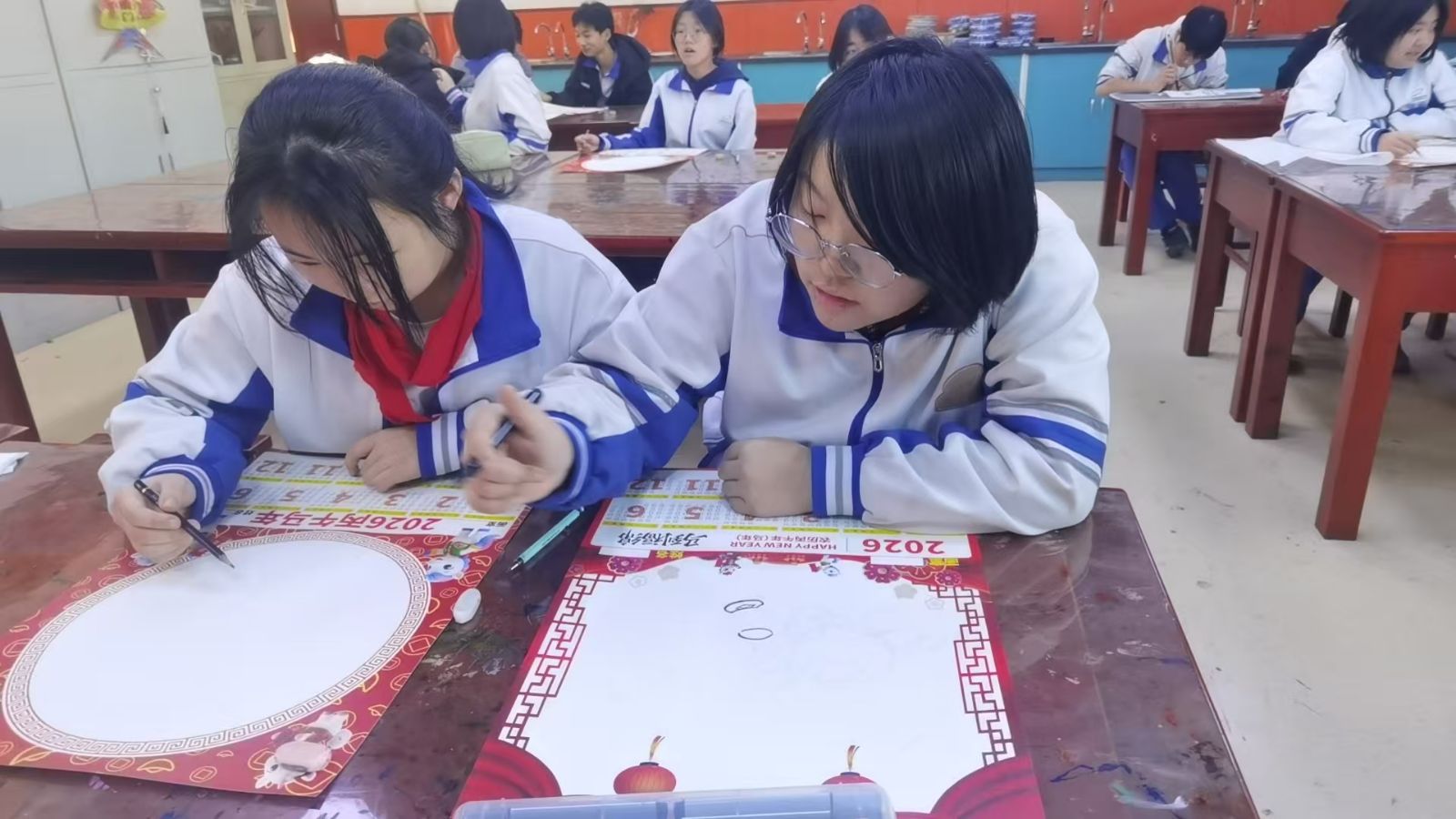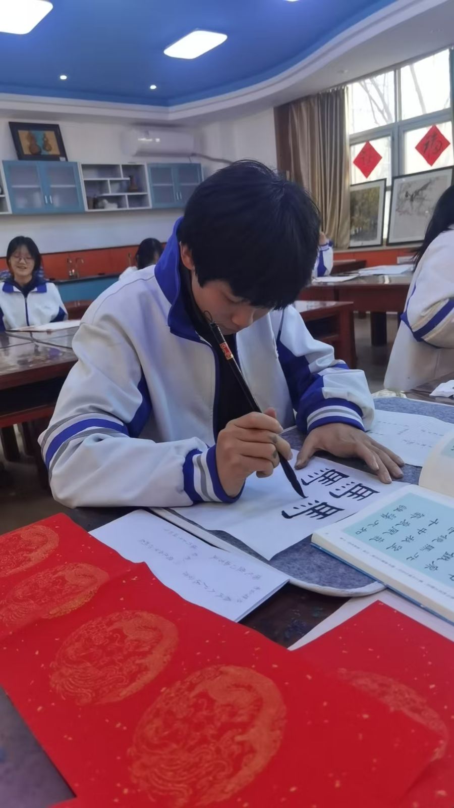 从12月20日开始,各班已陆续确定创作人员、碰撞创作思路、准备书写工具。12月26日,同学们将挥毫泼墨,把心意写在红色宣纸上,完成三副优质春联的创作与提交。
