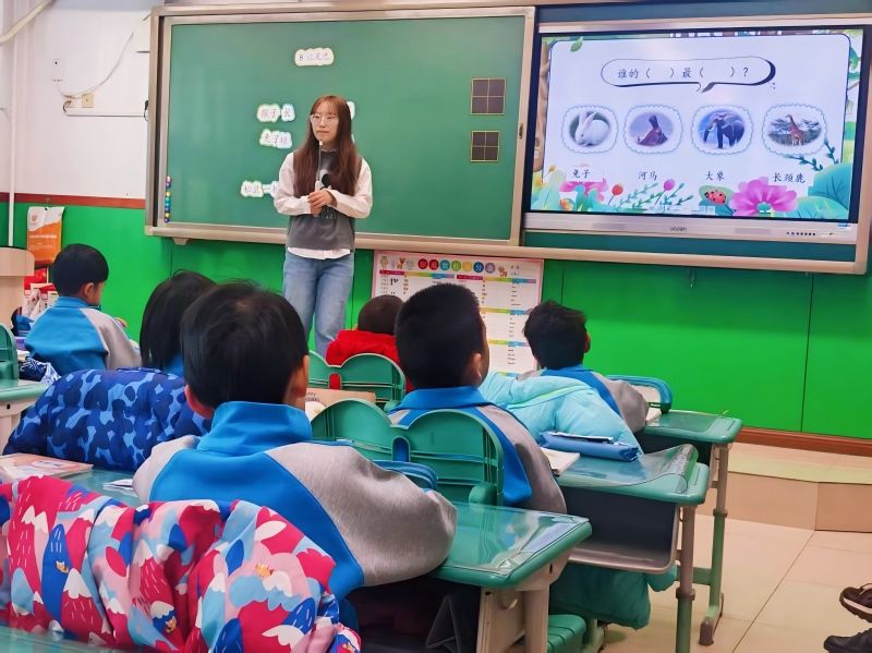 活动中,两位教师先后展示了精彩的低段语文课堂教学。第一节课由白宇璠老师执教《比尾巴》一课。白老师紧扣新课标要求,聚焦语言运用与思维能力培养,以生动有趣的“玩转词语牌”活动点燃学生学习热情,夯实词语的积累。课堂上通过多样朗读,强化语言韵律感知、积累;随后延伸至生活场景,以“谁的( )最( )”进行语言积累运用,充分展现了低段语文 “学语言、用语言”。