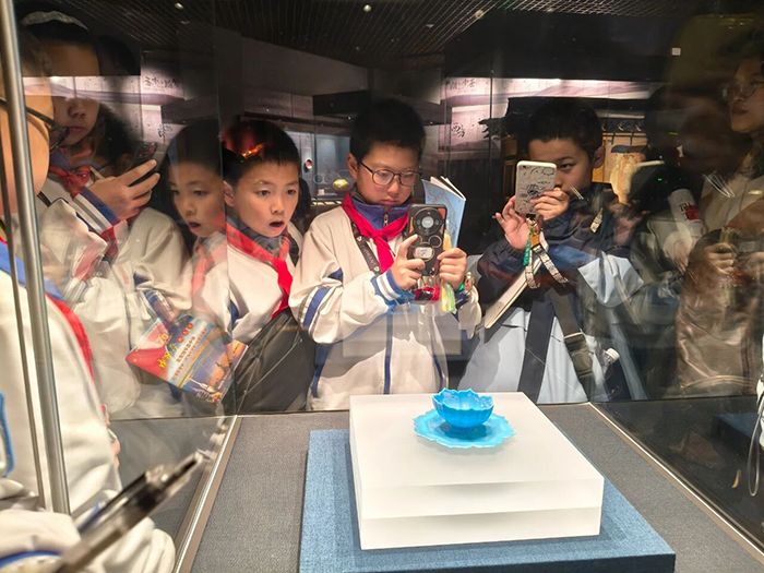 来到“彩陶故乡”展区,距今五千多年的马家窑文化的彩陶让同学们啧啧称奇。王老师顺势引导:“这些彩陶的纹饰是古人的艺术创作,就像我们设计航天模型外观一样,都需要想象力和创造力。”同学们纷纷围在展柜前,仔细端详彩陶上的漩涡纹和水波纹,并忍不住用手指在掌心上依样临摹。