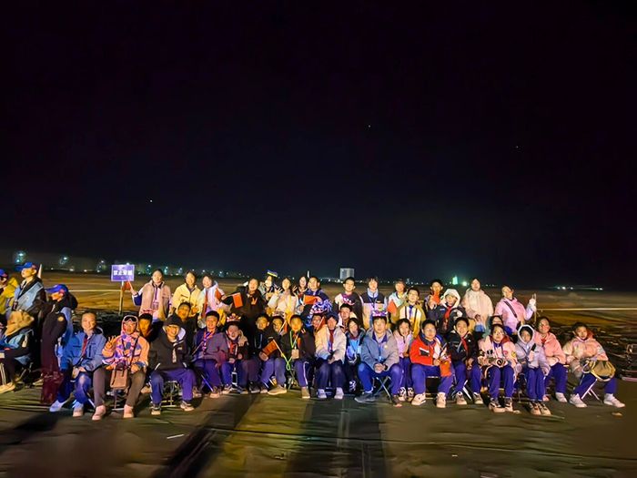 10月31日深夜,酒泉卫星发射中心的发射场上,神舟二十一号飞船静静矗立,发射塔架的灯光将船箭组合体映照得格外醒目。随着发射时间临近,观测区内的气氛愈发凝重。同学们或紧握相机期待记录瞬间,或目不转睛地凝视着远处的火箭,指尖不自觉地随着广播中的提示默默倒计时。当“……3、2、1,点火!”的指令响彻戈壁,橘红色的火焰骤然喷薄而出,巨大的轰鸣声震撼大地,船箭组合体带着万千期盼拔地而起,直冲深邃夜空。