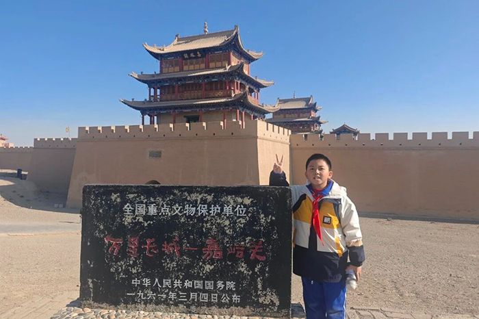 踏上嘉峪关城墙,眼前是屹立不倒的胡杨树,脚下是粗砺的砖石,耳边是呼啸了六百年的风。极目远眺,远处戈壁滩上的脚印仿佛让我听见了历史的回响——戍卒的号角、驼铃的响声、商队的交谈都在风中交织。站在嘉峪关城楼上,看着一望无际的戈壁滩,我心头一惊,这里的环境如此荒凉,战士们与航天人竟然还能长时间在这里保卫家国、研发火箭,他们的意志力太坚强了!站在“天下第一雄关”匾额下,方知何为“边塞”,何为“家国”。