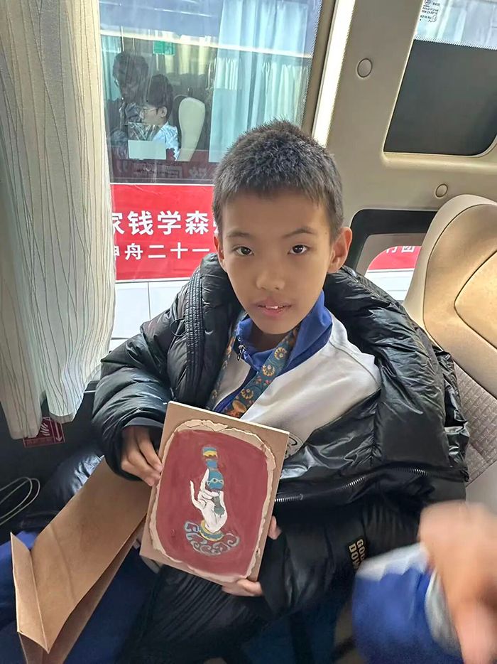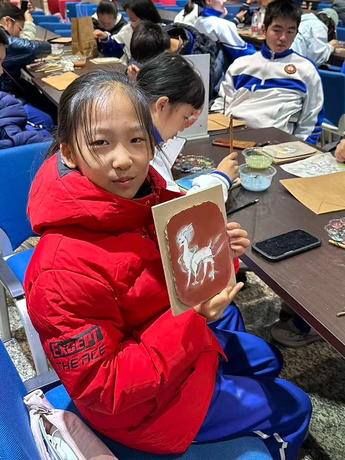上午的研学活动以文化体验为核心。在泥版画制作课堂上,同学们在专业老师的指导下,从和泥、调浆到制版、绘制,一步步体验传统工艺的精髓。指尖触碰着湿润的泥土,同学们充分发挥创意,将对敦煌文化的初步印象融入作品,一张张质朴的泥版画承载着少年们对传统文化的好奇与热爱。