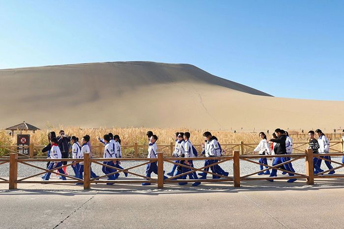 午后的阳光洒满大漠,同学们前往鸣沙山月牙泉。踏入景区,金黄的沙丘连绵起伏,驼铃声声回荡耳畔。大家兴奋地登上沙丘,感受沙子在指尖流淌的细腻触感。