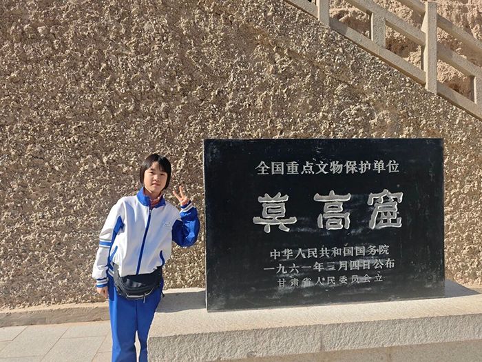 随后,同学们来到莫高窟,在讲解员的带领下参观洞窟壁画与彩塑。精美的飞天壁画、庄严的佛像雕塑,让同学们直观感受到古代工匠的精湛技艺与敦煌文化的博大精深,大家不时驻足凝视、认真记录,深刻体会到中华文化的源远流长。秋日的落叶给这趟旅途增添了别样的趣味,留下难忘的回忆。