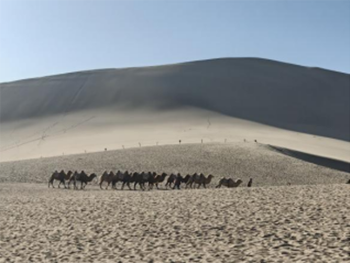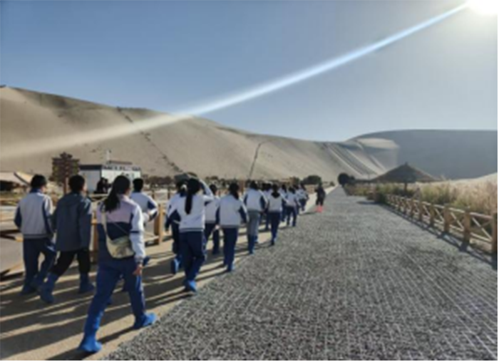 活动的开篇,便自带诗意与豪情。同学们站在茫茫鸣沙山之中,脚下是细软的黄沙,眼前是连绵的沙峰,耳畔是微风拂过的轻响。当“单车欲问边,属国过居延”的诵读声响起,《使至塞上》的千古意境瞬间与实景重叠。