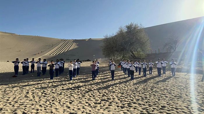 伴随着响亮的口号,同学们一招一式刚劲有力、整齐划一。弓步、冲拳、踢腿,动作舒展流畅,尽显少年意气。汗水顺着脸颊滑落,滴入黄沙,却浇不灭心中的热忱。在苍凉壮阔的沙漠中,传统武术与青春活力碰撞出别样火花,展现着新时代少年的强健体魄与精神风貌。
