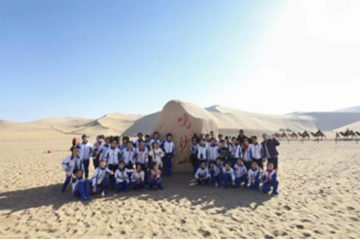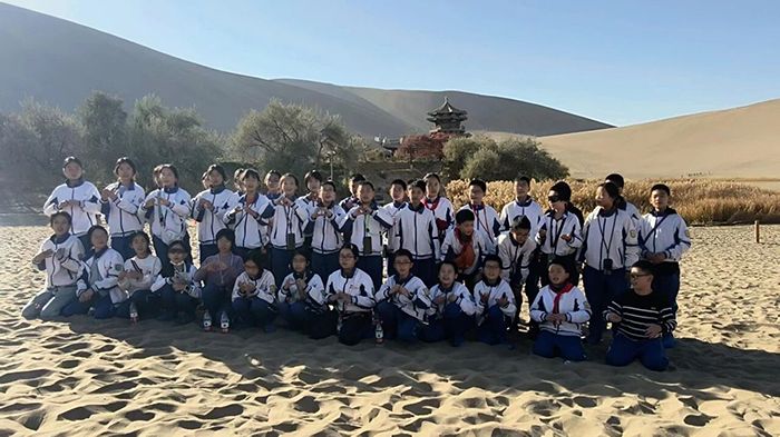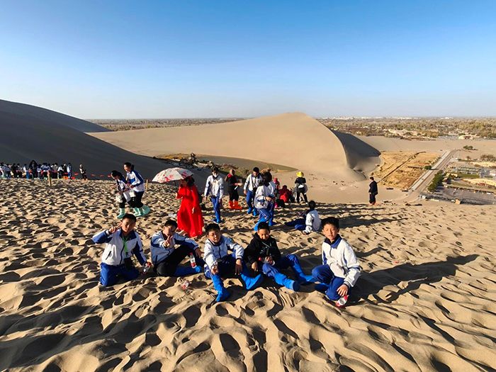 夕阳为鸣沙山镀上一层温暖的金光,同学们带着满满的收获与喜悦下山返程。在山脚下,大家再次集结,留下了一张珍贵的集体合影。照片里,每个人的脸上都洋溢着灿烂的笑容,眼里闪烁着成长的光芒。这堂特殊的自然体育课,不仅让同学们亲近了自然、锻炼了体魄,更在文化浸润中坚定了信仰,在协作攀登中学会了坚持。鸣沙山的风会记得,月牙泉的水会记得,这群少年在大漠中留下的笑声、汗水与成长足迹。