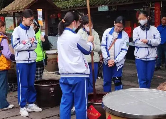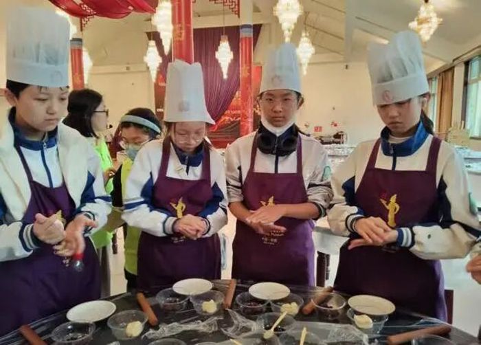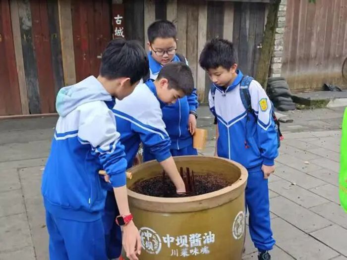 动手实践环节趣味盎然。手工体验区里,同学们亲手搅起古法酿造的酱油,醇香在指尖萦绕;揉面团、包蒸饺、压锅盔,每一个动作都沾满川菜的烟火气。从“看”到“做”,从“尝”到“懂”——原来一碟豆花、一块锅盔里,藏着巴蜀人把平淡日子过成诗的浪漫,藏着刻在骨子里的悠闲自在。