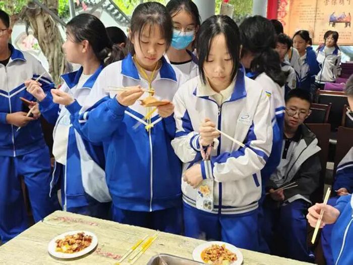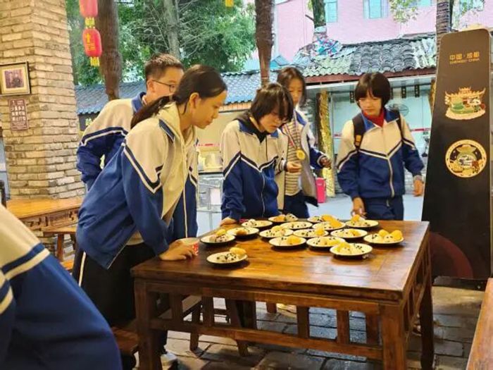 晚餐小吃街体验环节热闹非凡。同学们手持体验券,逐一品尝钟水饺、红油抄手、三大炮等特色小吃,甜辣鲜香在舌尖交织,纷纷称赞川式小吃的独特魅力。听老师傅讲解菜品的烹饪技巧与背后的民俗故事,让味觉体验更添文化内涵。