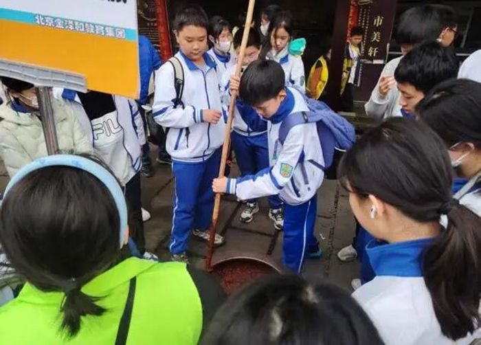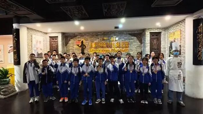 午后,师生们转场川菜博物馆,刚踏入大门,麻辣鲜香的气息瞬间唤醒味蕾。在历史展区,从古朴的青铜炊具到满缸的古法豆瓣,从脉络清晰的川菜流派图谱到“五味调和”的烹饪哲学,讲解员生动讲述着川菜从民间小吃到菜系瑰宝的演变历程,让同学们真切明白“一菜一格,百菜百味”的背后,是代代相传的文化积淀。