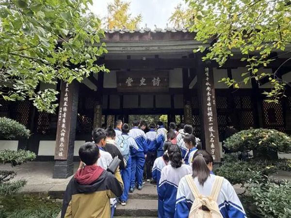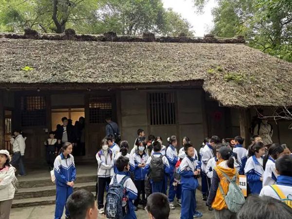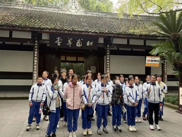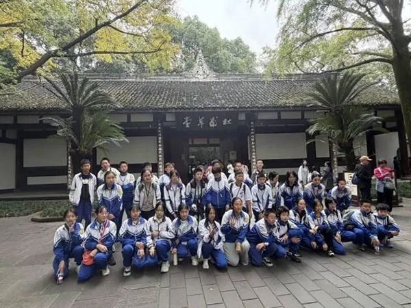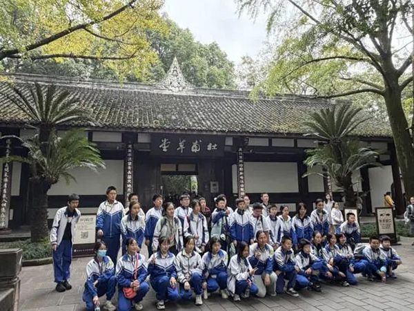 踏入杜甫草堂,绿荫掩映间仿佛穿越千年。青瓦白墙,竹影摇曳,流水潺潺。在“安得广厦千万间”的诗碑前,同学们凝神驻足,随着讲解老师的轻声诵读,那位心系苍生的诗圣仿佛近在眼前。千年的家国情怀,如细雨般无声浸润心田。