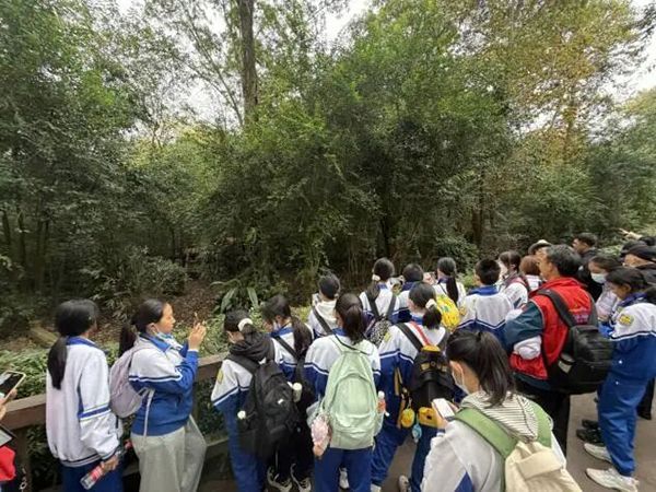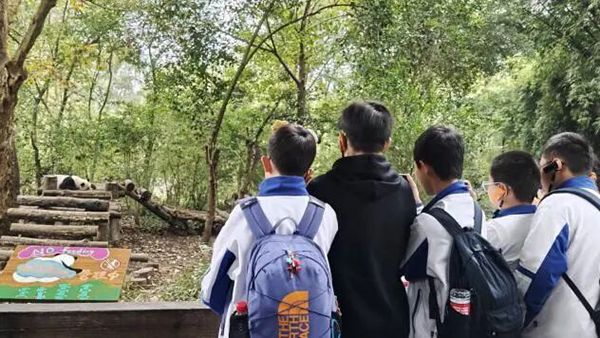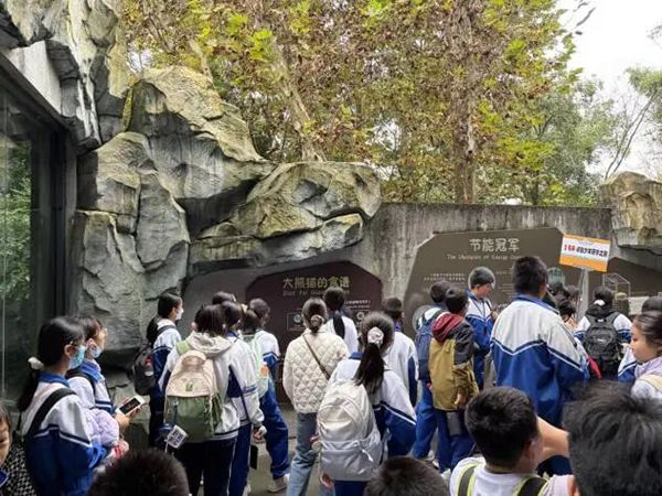 上午,同学们步入成都大熊猫繁育研究基地——一个被“团子”主宰的治愈乐园。大熊猫或怀抱竹笋大快朵颐,或趴在树干上打盹休憩;不远处,橘红色的小熊猫在枝桠间灵活穿梭,绒毛在阳光下泛着温暖光泽。同学们踮起脚尖、轻声细语,唯恐惊扰这片宁静。在讲解老师生动的叙述中,他们不仅了解了熊猫的习性,更在心中悄然种下生命教育与生态保护的种子。